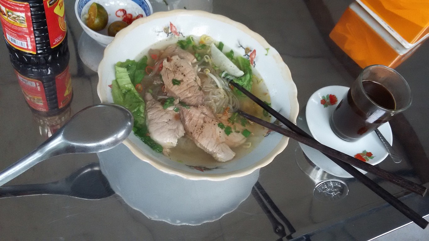 ![]() 2 Pho Bo This is the mother of all vietnamese dishes, rice noodle soup ("pho") with fresh herbs and beef ("bo"). It is eaten at all times of the day, but particularly popular for breakfast. |