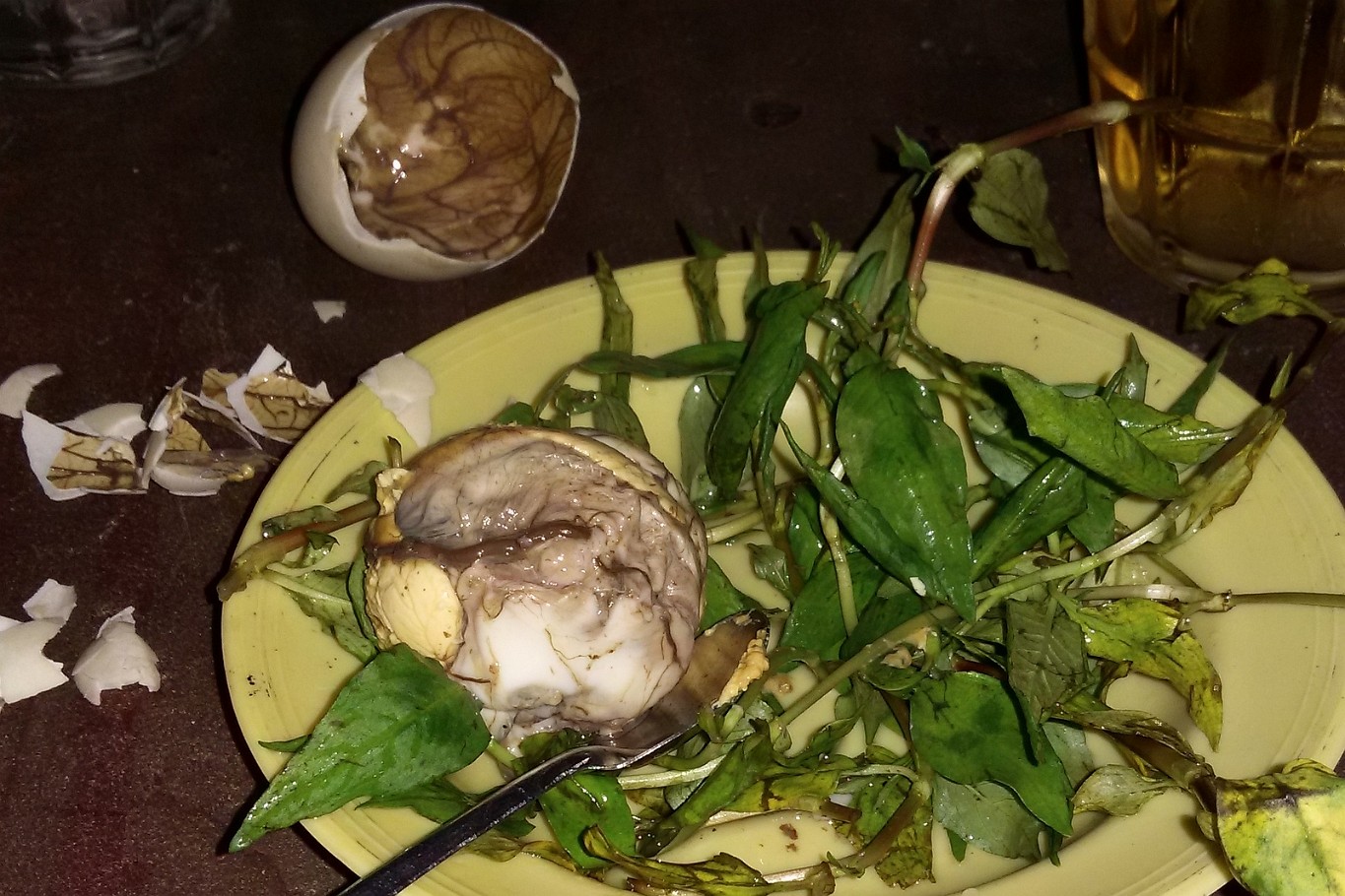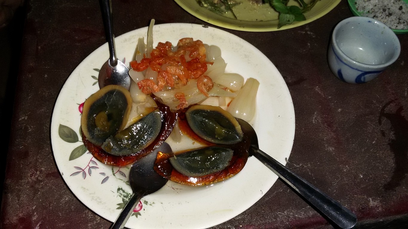 ![]() 10 Food Experiments II Looking a bit less tasty, but of course a "must try" once there is the opportunity, this is a half-hetched duck egg ("duck embryo"). It tastes better than it looks, basically just like a boiled egg. Maybe a bit more chewy, though... |