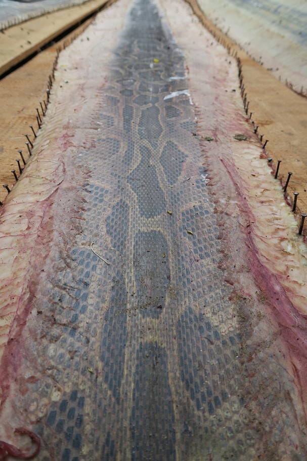 ![]() 7 Snake Skins ... or more exotic establishments as this snake farm, producing boa skins for soon-to-be handbags (this one being mounted for drying). |