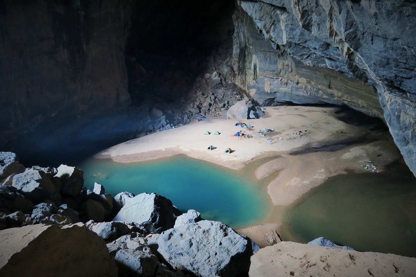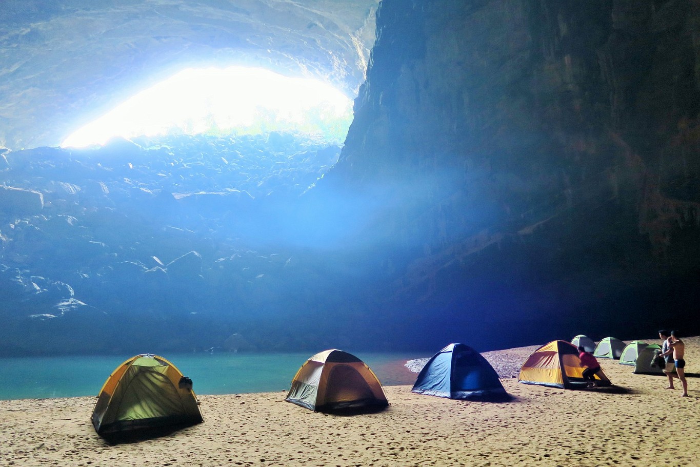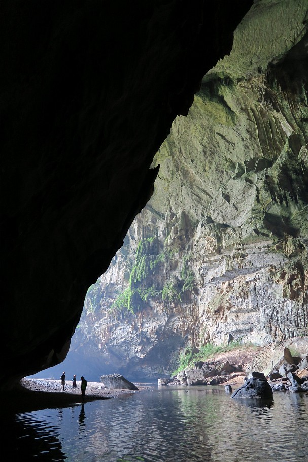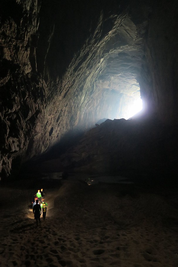![]() 56 Hang En Cave So here it is - the worlds third biggest cave (or at least part of it). On the sand benche, our porters are already building up the campsite and start cooking for dinner... |