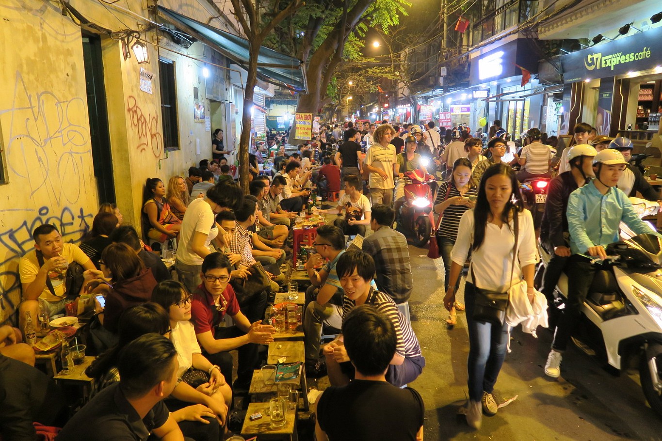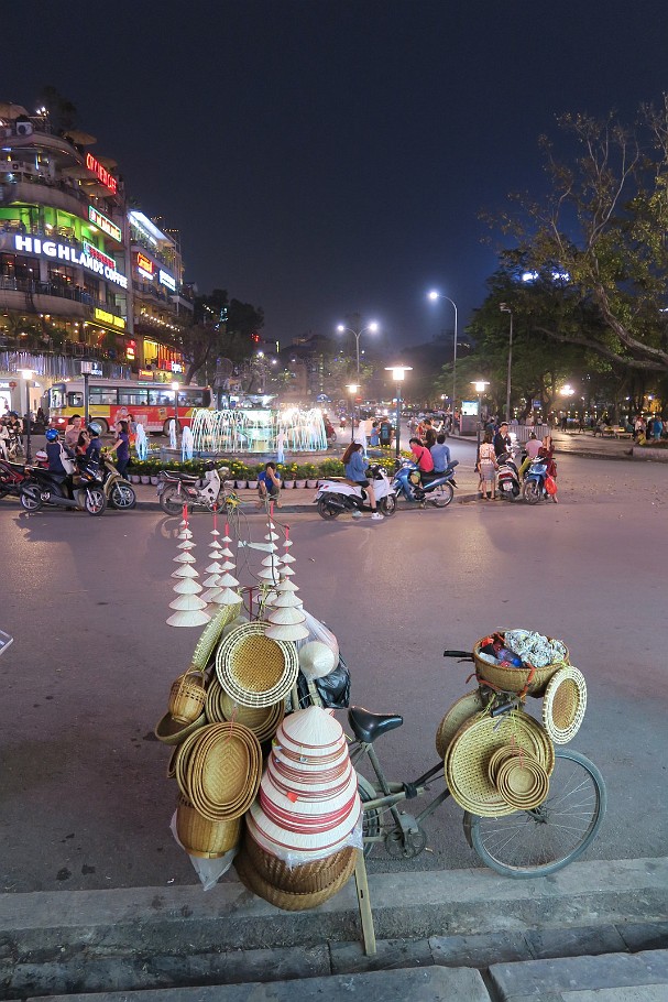 ![]() 69 Hanoi Street Life 4 In Vietnam, everything is transported with a motorbike, and everything is sold from a bicycle, so why not hats? At least they make for a good foto target in front of the Hanoi night lights... |